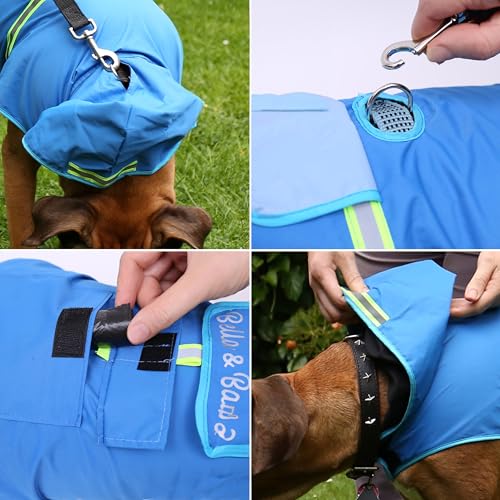 Details: Bella & Balu Hunderegenmantel – Wasserdichter Hundemantel mit Kapuze und Reflektoren für trockene, sichere Gassigänge, den Hundespielplatz und den Urlaub mit Hund (S – Blau)
