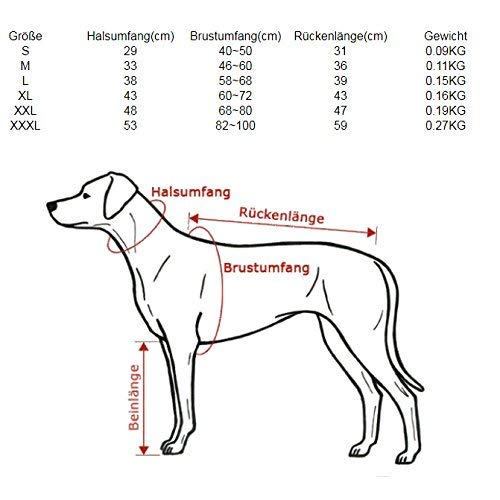 • Wichtiger Hinweis:​​ Bitte messen Sie die entsprechenden Maße Ihres Hundes vor dem Kauf unbedingt genau nach, um die richtige Passform und Bequemlichkeit sicherzustellen. Die Wahl der korrekten Größe ist für den optimalen Tragekomfort entscheidend. Größenangaben: S: Rückenlänge: 31 cm; Brustumfang: 40 – 50 cm; Halsumfang: 29 cm. Gewicht: ca. 90 g. M: Rückenlänge: 36 cm; Brustumfang: 46 – 60 cm; Halsumfang: 33 cm Gewicht ca.: 110 g. L. Rückenlänge. 39 cm; Brustumfang: 58-68 cm; Halsumfang: 38 cm; Gewicht: ca. 150 g. XL: Rückenlänge: 43 cm; Brustumfang: 60 – 72 cm; Halsumfang: 43 cm; Gewicht: ca. 160 g. XXL- Rückenlänge: 47 cm; Brustumfang: 68-80 cm; Halsumfang: 48 cm. Gewicht ca.: 190 g.