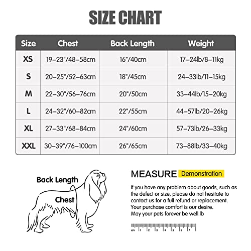 • 【Holen Sie sich die richtige Größe】 Damit Ihr Hund diese Weste bequemer tragen kann, messen Sie bitte vor dem Kauf den Rücken, die Brust und den Hals des Hundes.