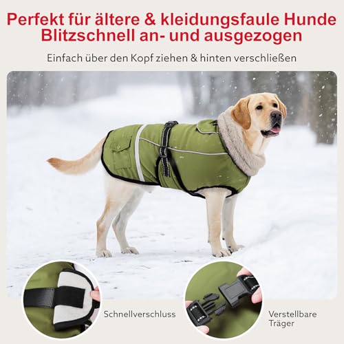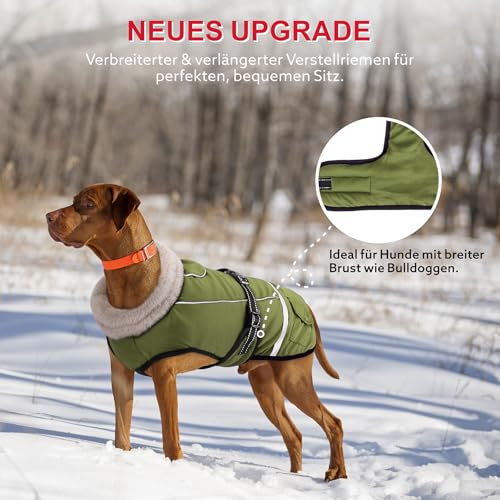 Details: Woiil Hundemantel Winter, Hundemantel Wasserdicht für Kleine Hunde mit Verstellbaren Schultergurten, Hundejacke aus Fleece, Reflektierende Streifen, Geeignet für Jack Russells(M,Olivgrün)