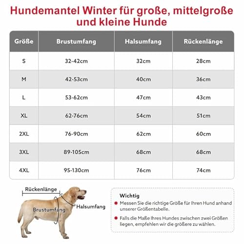 • Die richtige Größe wählen – Die Hundemantel wasserdicht ist in den Größen S, M, L, XL, XXL,XXXL und 4XL erhältlich. Bitte messen Sie vor dem Kauf den Halsumfang, Brustumfang und die Rückenlänge Ihres Hundes gemäß der Abbildung. Wenn das Messergebnis zwischen zwei Größen liegt, wählen Sie die größere Größe.Hinweis: Ein Maßfehler von 2-3 cm ist im normalen Bereich.